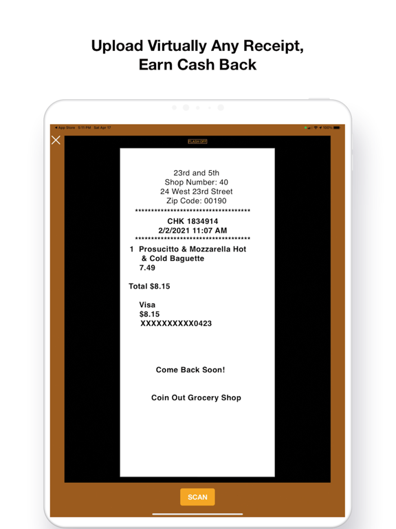 Upload any receipt in the app and earn cash back. You don't have to find specific deals or take time to see if a certain retailer is on the program. Just snap and earn! Receipts need to be uploaded within 2 weeks of original purchase and include date, retail name, items purchased, bill amount and be readable. Our software will cancel non receipts or non readable transactions automatically.