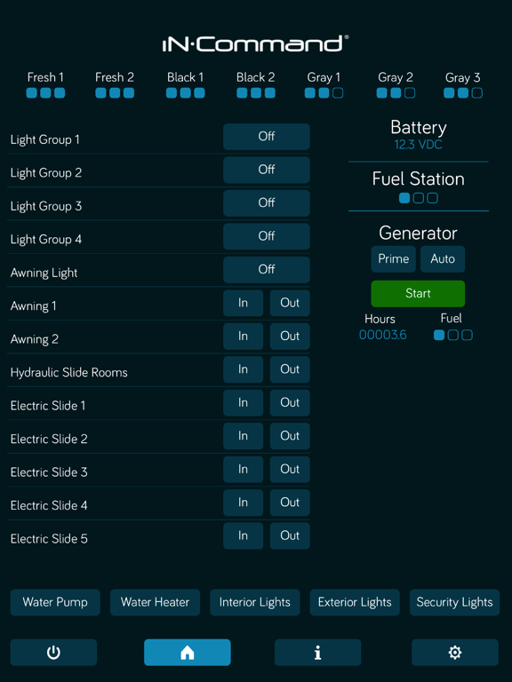 • Lighting control: Interior, exterior, security, awning and custom 1, 2, 3