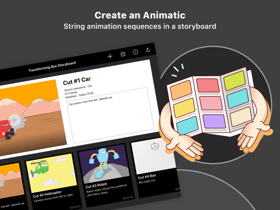 Dream big with Animation Desk. Draw frame-to-frame animation from scratch, or create animations upon videos, images, Photoshop layers. Animation Desk supports multiple export formats. Create animation on your iPad and iPhone with Animation Desk.