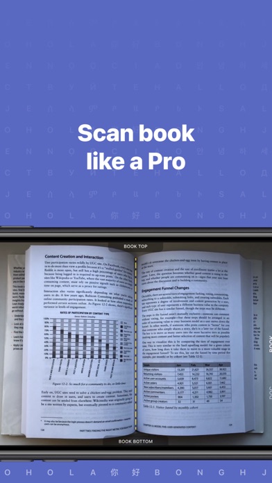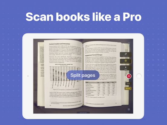 • BOOKSCAN TECH. When scanning books, BookScan will split the opposing pages into two separate images and correct any distortions and lighting defects. It will unbend any curved lines as if you pressed the book against the glass of a conventional scanner (Internet required, up to 100 pages per document).