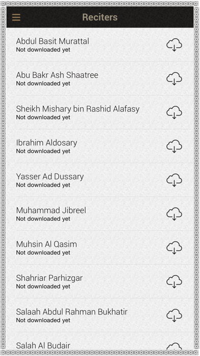 • Complete list of reciters is Hedayatfar ,Kabiri ,Ibrahim Walk ,Shamshad Ali Khan ,Abdul Basit Murattal n Mujawwad ,Abu Bakr Ash Shaatree ,Sheikh Mishary bin Rashid Alafasy ,Ibrahim Aldosary ,Yasser Ad Dussary ,Muhammad Jibreel ,Muhsin Al Qasim ,Shahriar Parhizgar ,Salaah Abdul Rahman Bukhatir ,Salah Al Budair ,Saood ash Shuraym ,Warsh Yassin al Jazaery ,Abdullah Basfar ,Ahmed Neana ,Abdur Rahmaan As Sudais