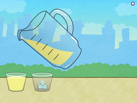 In Lemonade Stand, children pick up and tilt the iPad to slide the same number of ice cubes into cups. Don't let ice cubes fall off the table or let ladybugs get into the cups! Pour and drink lemonade with Gracie and her friends. Mmm! Delicious!