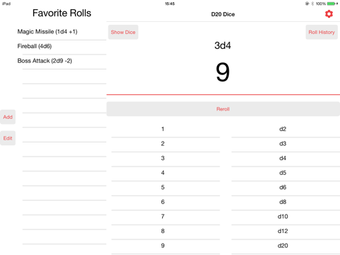 Dice Roller for tabletop RPGs and other games. Features: * Roll any number of a chosen dice type * Re-roll available after a user-specified cool down time period * Specify your own dice type up to a d10000 * Save & Edit favourite rolls that can be assigned names and modifiers * Individual dice results * Recent history of dice rolls More features planned for the future.
