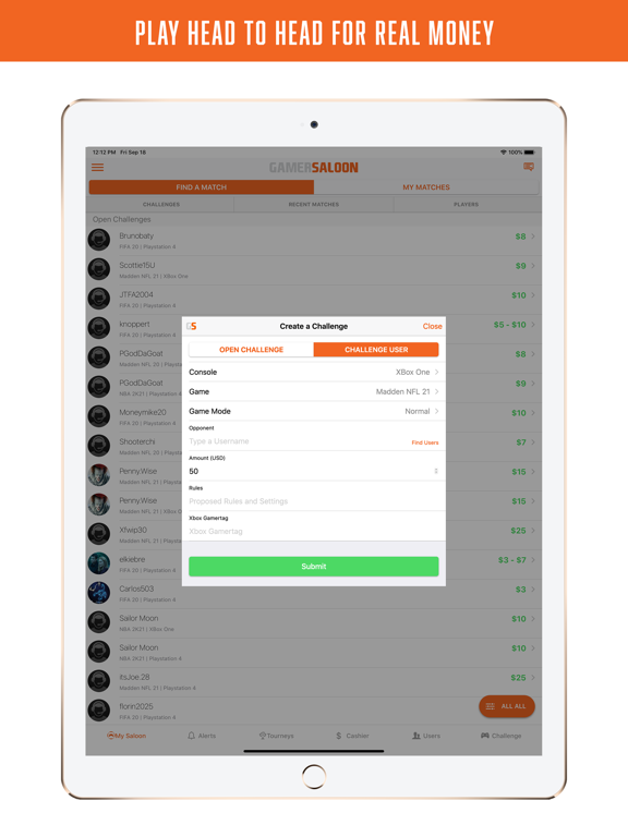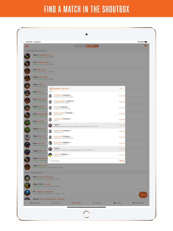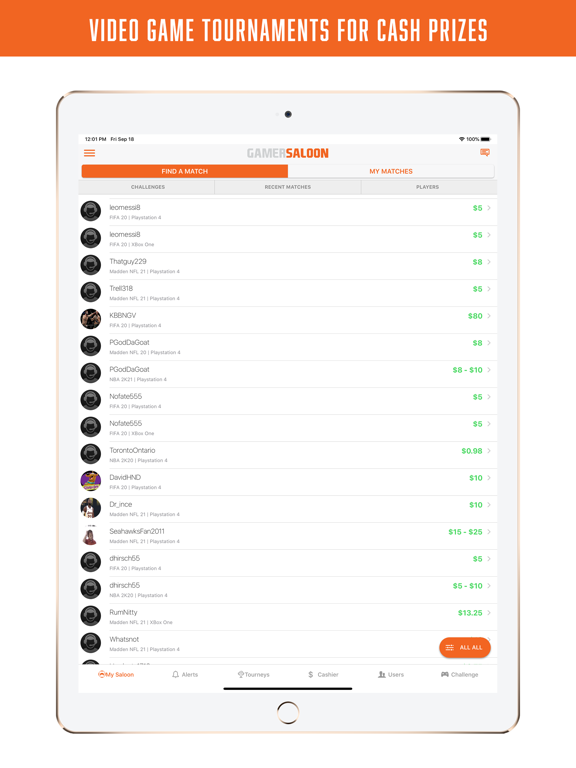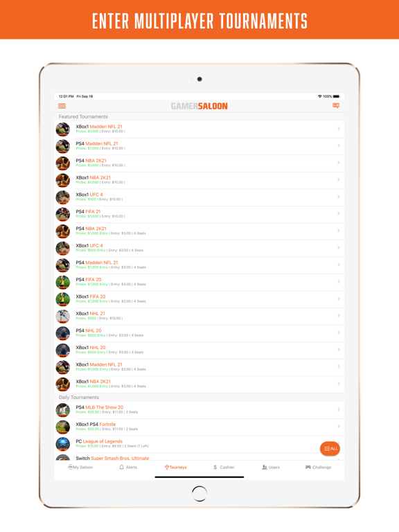 With the GamerSaloon App, players have access to the GamerSaloon.com global community of gamers who are ready to compete for cash prizes in all the popular skill-based video games. Enter multiplayer tournaments launching daily or compete whenever is convenient for you. All major consoles and skill-based video games are supported, simply set up the match via the app and go play!