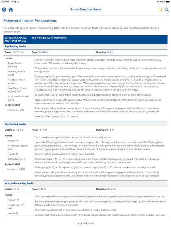 • Indications and dosages, as well as route, onset, peak, and duration information