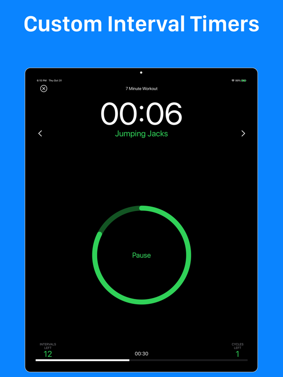 Let Intervals Pro guide you through any type of interval workout: HIIT, running, strength training, yoga, stretching, circuit training, boxing, MMA, elliptical, rehabilitation, meditation, 7 minute workouts and many more.