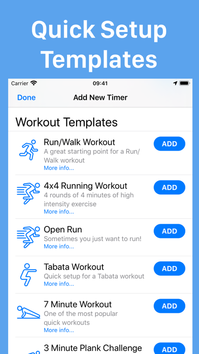 • 3 timer types, 6 workout templates, and a 2 Running Training programs