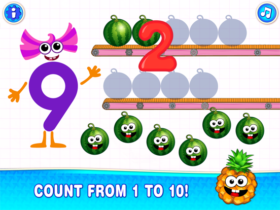 While playing with little number-characters your child will learn numbers and how to write them. They will master counting and learn the correlation between numbers and quantities.