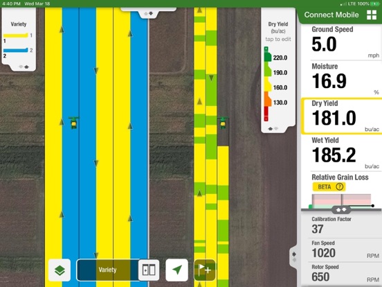John Deere Connect Mobile is a mobile application downloaded onto an iPad to monitor, optimize, and ensure high quality operations; and the best job possible. The Connect Mobile app connects to the machine through a WiFi network to document and display quality, productivity, and agronomic data about the operation. The app works in conjunction with either the GreenStar™ 3 2630 or Generation 4 4600 & 4640 CommandCenter™ displays.