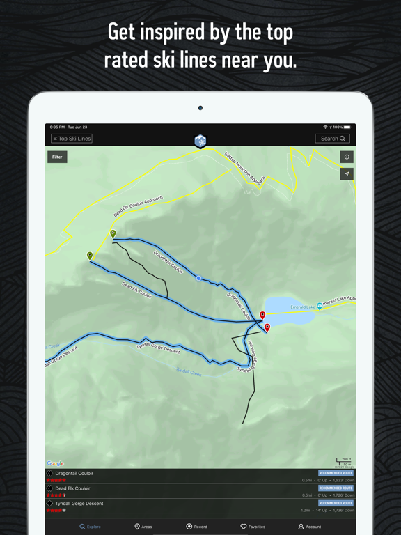 With the thoroughness of a printed map, we offer full GPS route info, elevation profiles, interactive features, photos, and more. Like a guidebook, we suggest the best featured ski lines to explore—either near your current location or in an area you search for. Local experts show you the highlights, challenging features, and insights you need to plan a great day in the snow.