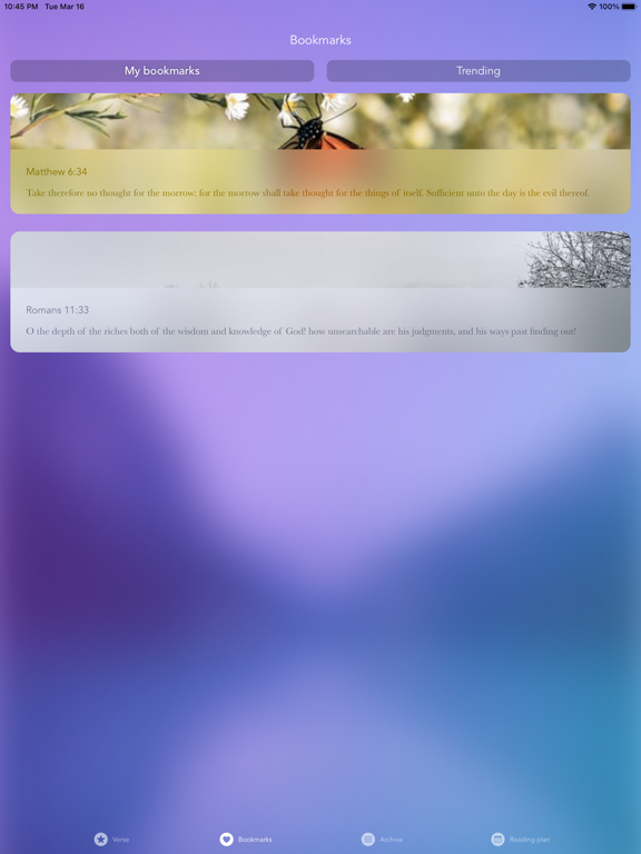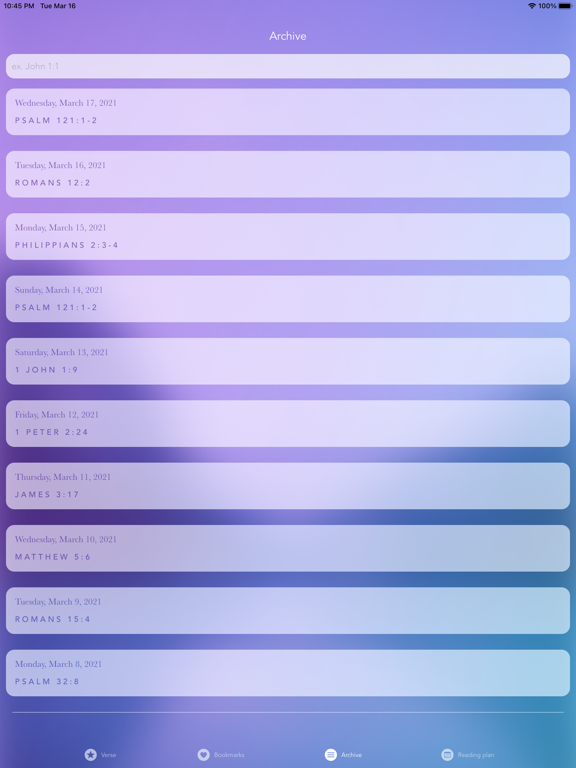 An easy to use app for all ages and generations, beutifly displayed for you convinience. Multiple bible translations are supported in Daily Holy Bible Devotions, King James Version (KJV) and American Standard Version (ASV). Bookmark your favourite verses and access them at a later date and point in time or quick search for your favourite verse. Become inspired each day, week and year with our carefully created verse reading plans.