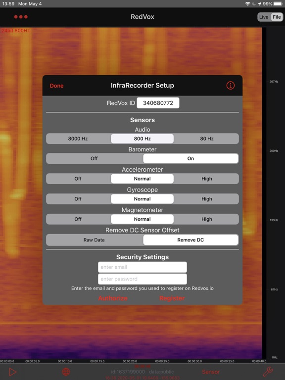 The main display shows the infrasonic pressure recorded with the internal microphone and (if available) barometer, accelerometer, magnetometer, and gyroscope. Microphones plugged in through the data port or audio jack will override the internal microphone.