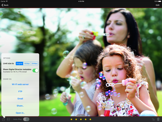 Download your still images onto the iPad for post-production and share your images via the social network of your choice, by e-mail, FTP or your computer via Wi-Fi web server – from the "Digital Director" App.