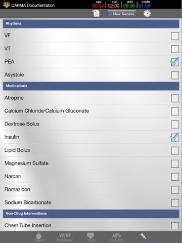 CARMA has four independent countdown timers, swipe-able Ventricular Tachycardia & Ventricular Fibrillation and Pulseless Electrical Activity (PEA) reference pages. There is a complete list of select-able Diagnostic Tips (H's and T's) and recommended medication and non-medication treatment solutions. CARMA is an invaluable, portable tool for healthcare professionals in the resuscitation of patients experiencing cardiopulmonary arrest.