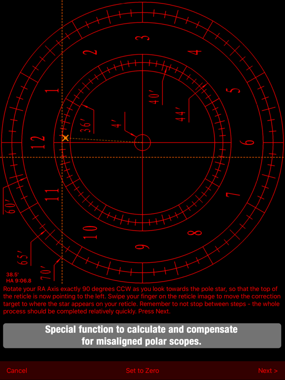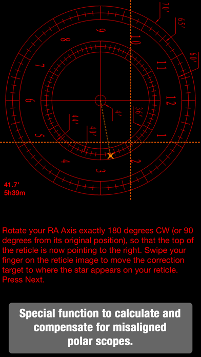 Polar Scope Align will calculate the position of Polaris or σ Octantis in your Polar Scope reticle for your location (using your phone's GPS or manually), allowing a quick and accurate polar alignment. It is one of the few programs that are accurate in lower latitudes by correcting for atmospheric refraction (so expect results to agree only with precise software and not most simplistic "polar align" apps - see the "Accuracy" section in help for details). It will even allow you to measure and correct a centering error of the reticle. In the settings you can select from a vast collection of reticles, one that matches your own. Pretty much every reticle in the market is supported: