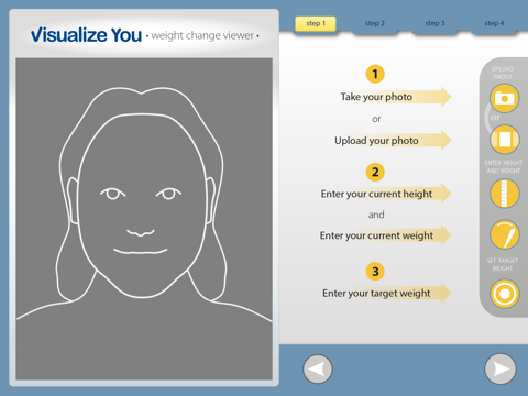 In three easy steps, the Visualize You app transforms your image to show the dramatic effects of weight loss. Alternately, you can set a heavier target weight to see the negative effects of an unhealthy diet and lifestyle. To get started, simply upload your photo from your library or use your smart phone to take a photo of your current self. Information guides imbedded in the app will help you take the best resulting image. After entering your height, weight, and desired target weight, define and adjust your image using the intuitive touch screen controls. Hit the ‘next’ button and, voilà, the new you will appear on your phone, providing inspiration and motivation to reach your target weight loss goal. You can even save and send the new you image to your support team of family and friends who will encourage you to achieve your desired weight goal.