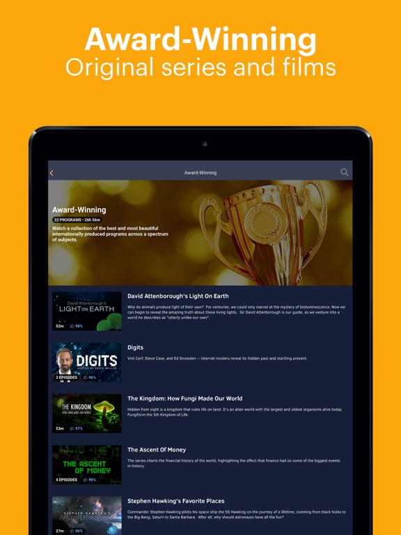 Learn about our natural world alongside luminaries like Sir David Attenborough. Look at our universe with wonder as Michio Kaku and Brian Greene broaden your perspective on space, time and the future. Step back in time and explore dinosaurs, ancient history, and the rise of homo sapiens.