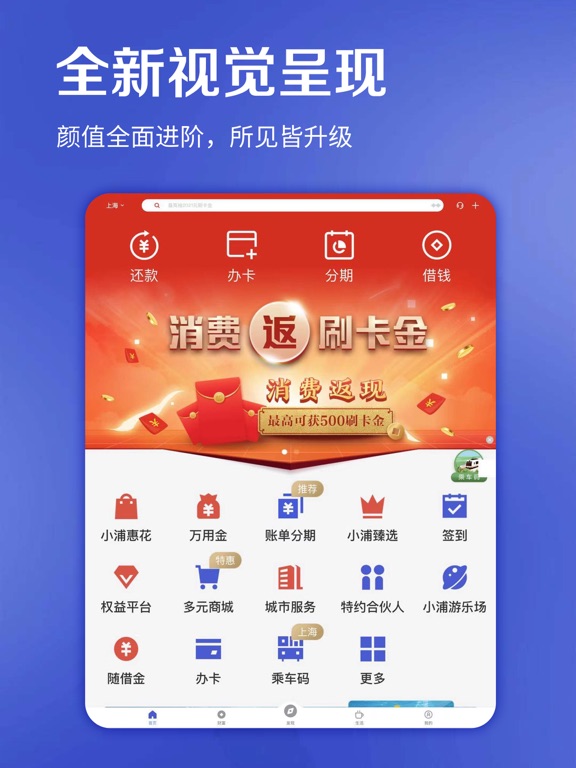 浦大喜奔,是一个金融生活方式。 ——浦发银行信用卡唯一官方APP 【产品特色】 1.精品专属推荐:千人千面智慧推荐,方寸之间看见大不同; 2.智慧资产服务:联通借记卡&信用卡,金融科技为你护航; 3.美妙发现之旅:新潮资讯干货满满,重构你的碎片时间; 4.品质生活升级:定位你身边的优惠,更多美好触手可及; 5.一手福利汇聚:惠民权益懂你所想,每天都能收获新惊喜; 6.随心自在分期:定制化分期产品,梦想之路无需再等贷; 7.尽享高端专区:多重高端卡专属福利,全在你的VIP礼遇。 【联系我们】 官方微信:浦发银行信用卡