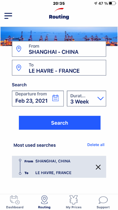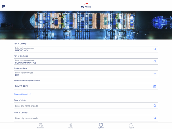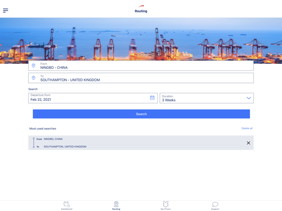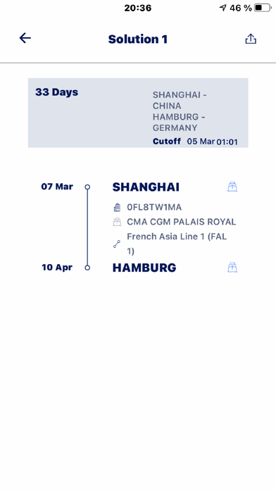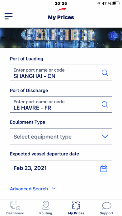 Use the CMA CGM App to check port-to-port schedules and organize your shipment. Directly plugged onto the CMA CGM’s Information System, the App will provide information and optimized routing solutions, selected among more than 200 shipping lines and over 500 vessels calling at 420 ports all around the world.