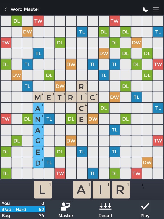 Create words with the 7 letters on your rack and place them on the 15 by 15 tile board. Boost your score by placing letters on the special Double Letter, Double Word, Triple Letter and Triple Word bonus tiles.