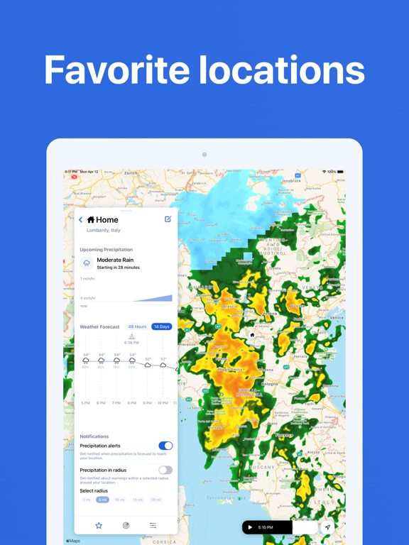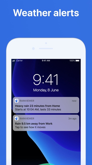 Don't take chances when rain, snow, or any other type of precipitation heads your way. RainViewer notifies you with rain alerts like: "Rain starts in 23 mins and lasts 58 mins." Configure them as instant or in-radius notifications to warn you to expect rain near your favorite location, so you're always ready.