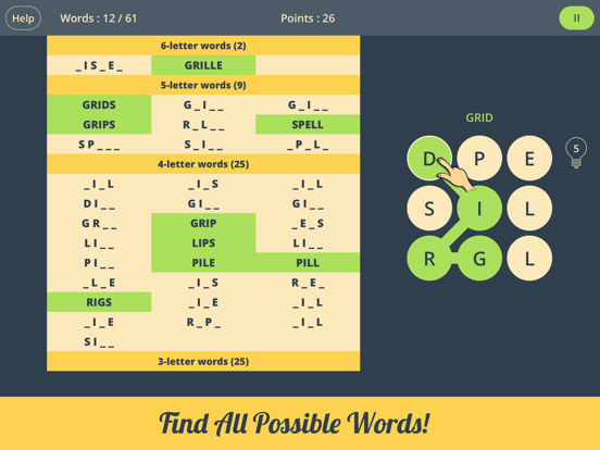 Swipe over the letter tiles and try to spell all the valid words in the grid!