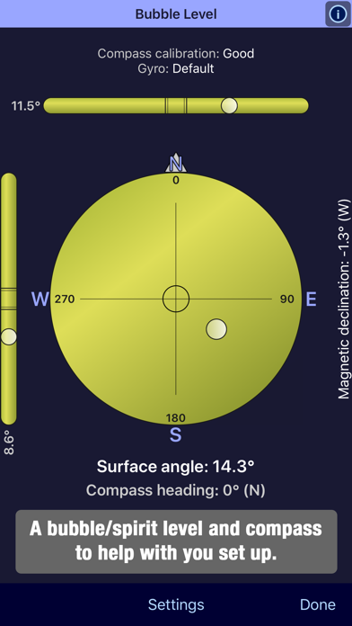 -Bubble level (using either gyro or accelerometer) and Compass heading, as well as magnetic declination reading.