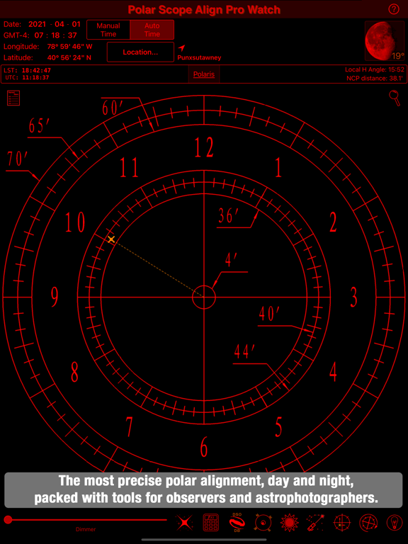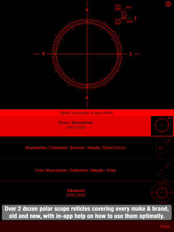 Polar Scope Align will calculate the position of Polaris or σ Octantis in your Polar Scope reticle for your location (using your phone's GPS or manually), allowing a quick and accurate polar alignment. It is one of the few programs that are accurate in lower latitudes by correcting for atmospheric refraction (so expect results to agree only with precise software and not most simplistic "polar align" apps - see the "Accuracy" section in help for details). It will even allow you to measure and correct a centering error of the reticle. In the settings you can select the polar scope reticle that matches your own, from a vast collection: