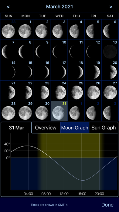 -Moon phase & lunar Calendar with solar/lunar rise/set and twilight times.