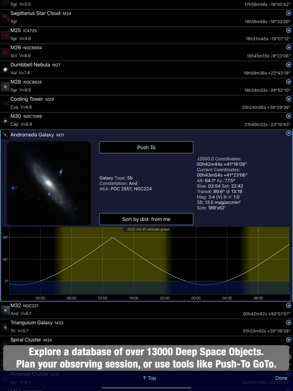 -Deep Space Object (DSO) Database with 22000+ objects from several catalogs (Messier, Caldwell, NGC, IC, Herschell 400, Sharpless 2, Barnard), along with stars (Yale Bright Star) & planets. Search, apply filters, sorting, download DSS color images for all items, or get help finding them with your non-goto telescope with the Push-To function.