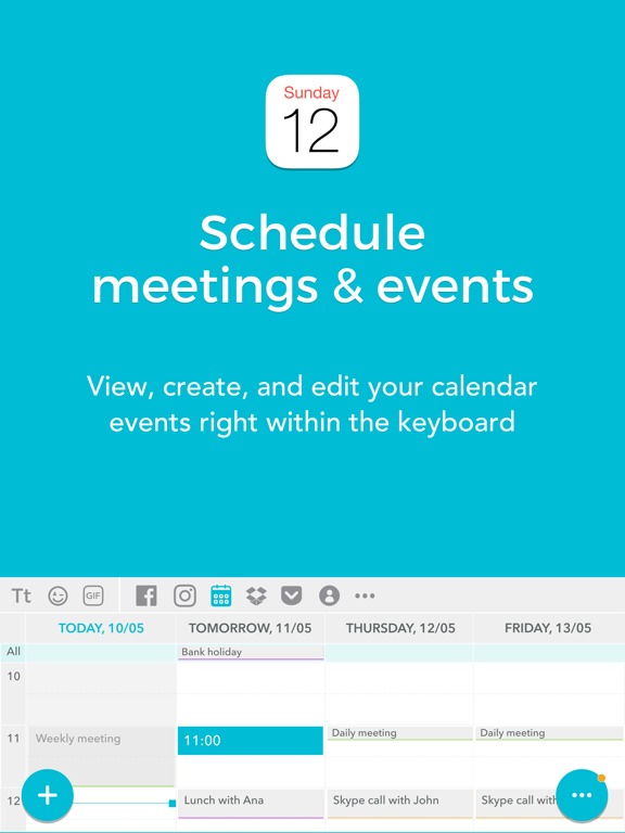 Access your calendar to conveniently select and share your available slots. Schedule the perfect time to meet 1-to-1 or as a group, without switching apps. Plan your schedule in ANY messaging app through the keyboard.