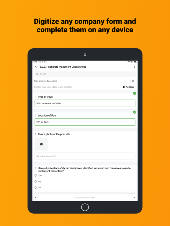 checklists, forms, inspection, camera, photo, picture, comment, description, location, monitor, project, site, address, job site, company, business, facility, property, contracting, construction, real estate, maintenance, franchise, security, safety, quality control, construction management, CM, project management, engineering, audit, inspection, facilities, properties, property management, development, job site documentation, safety audits, qc inspections, monitor and inspect job site progress