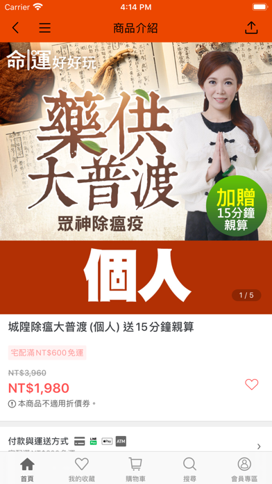 《命運好好玩》 是台灣最持久的命理節目,節目主持人與各大權威命理老師,預測現在及未來的運勢,特別收錄開運秘法。 立即下載,官方開運行動APP - 精彩節目立即看,每週星座運勢立即掌握。 - 命理權威設計,各式各樣開運法寶,大師親挑開運吉時。 - 專屬好康、重要法會活動,免排隊點燈,絕不錯過! - 節目名師算命介紹,任何問題通通有解!幫您預知未來、找出機會的關鍵時刻,改變運勢,開創美好人生! * 以手機號碼就可輕鬆加入會員。 1)簡單易懂的操作介面,第一次使用就上手。 2)開運主題分類選單,提供專業貼心的購物服務。 3)收藏商品,降價立即通知。 4)超商付款取貨最方便。 5)信用卡快速結帳使用SSL 128 bits最高安全等級加密機制,保障個人隱私資料。