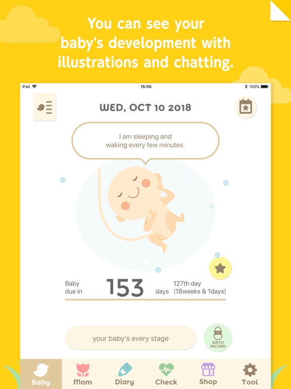 The cute illustrations of the baby will make different adorable gestures each time you open the app, and will grow based on the number of weeks of your pregnancy. The baby will also talk whenever you tap on the baby. The baby's lines changes every day, and will send you messages of encouragement and information on the baby's condition.