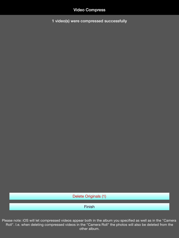 Please note: iOS will let compressed videos appear both in the album you specified as well as in the "Camera Roll". I.e. when deleting the new compressed videos in the "Camera Roll" the video will also be deleted from the other album.