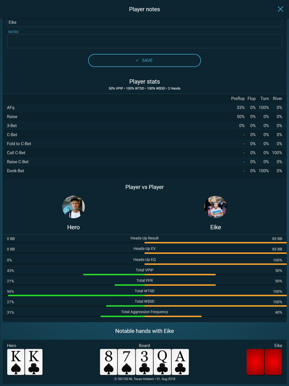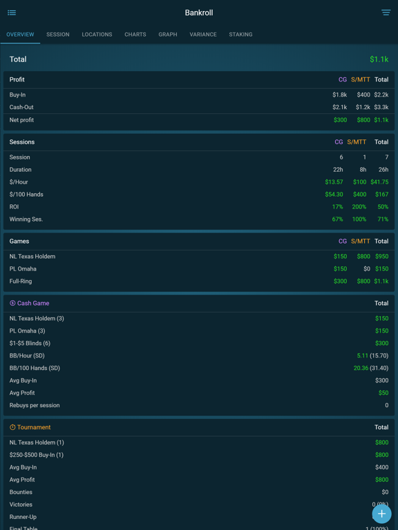 Record your poker sessions and share them with your friends! With Poker Bankroll Tracker you can save your poker sessions to have an overview of your bankroll. With many filter options you can find leaks in your game and see a lot of statistics. You can also connect with your friends and watch their sessions live! The Poker Bankroll Tracker also provides useful tools like an odds calculator, deal calculator or a payout calculator.